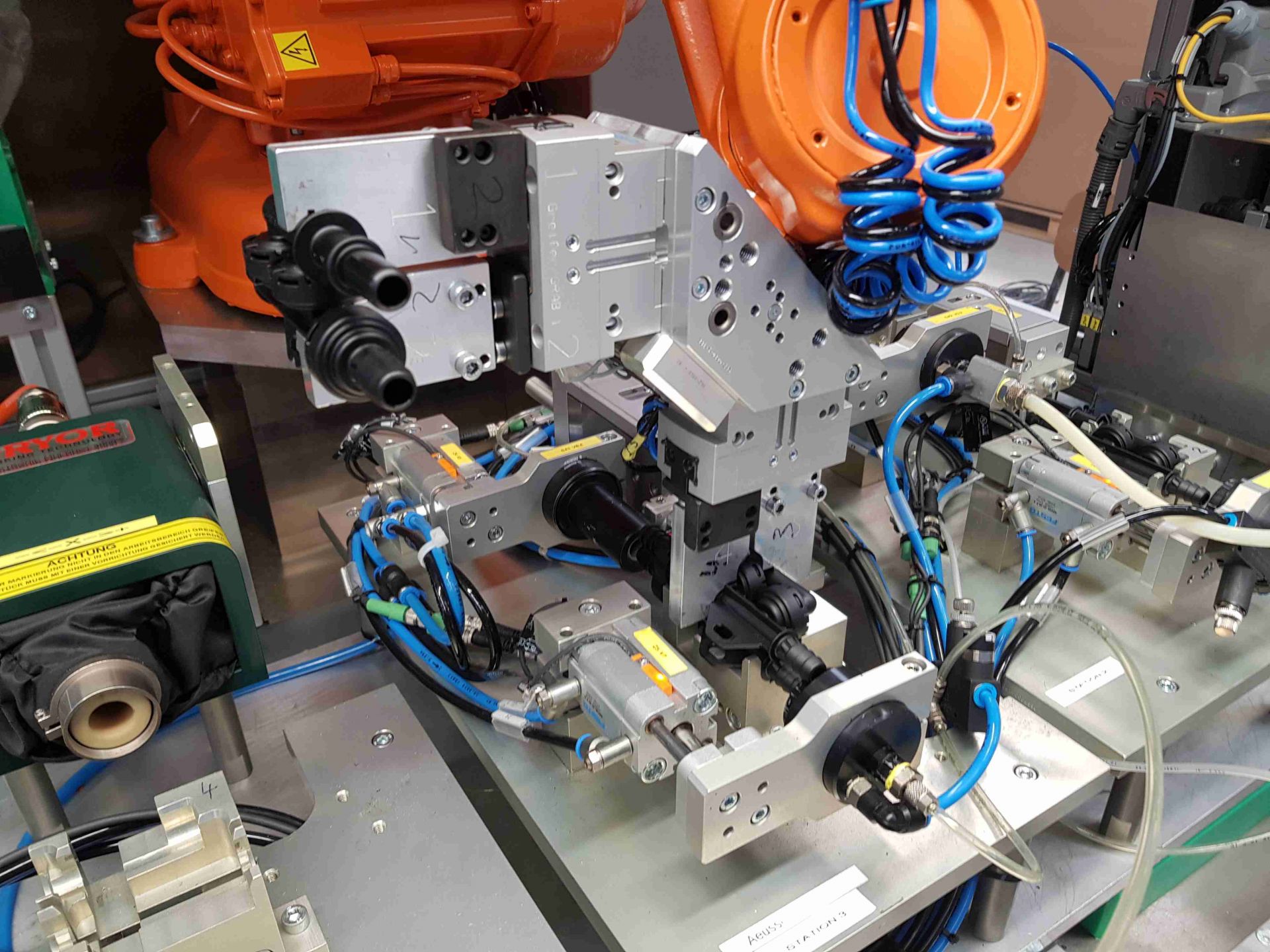 Durch einen Einlegetunnel werden die zu prüfenden Produkte manuell in eine Aufnahme gelegt und automatisch dem Prozess zugeführt. Der 6-Achsroboter entnimmt das Ventil und legt es in einer der Prüfstationen ab. Nach erfolgreicher Prüfung wird es signiert und in einer Kiste abgelegt. N.i.O.-Bauteile werden nicht signiert und einer abgeschlossenen Kiste zugeführt.
